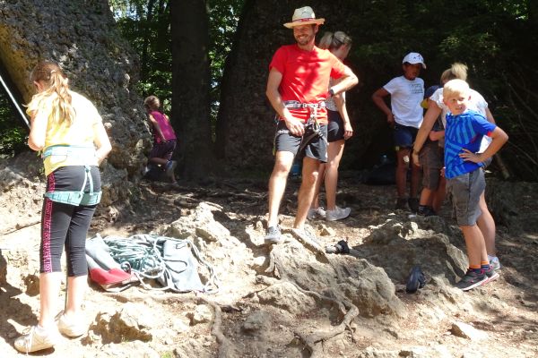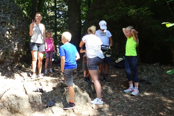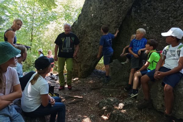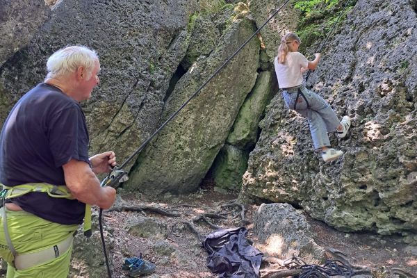 | Die Betreuerinnen Sonja Dresel und Julia Nürnberger luden die Kindergruppen der FFW- und des FSV Geschwand am 07. Juli 2023 zu einem Schnupperklettern an den Wolfstein bei Bärnfels ein. Unter der fachmännischen Anleitung des passionierten Kletterers Herwig Sedlmayer und der früheren Europameisterin im Lead-Klettern, Katrin Sedlmayer wurden die Kinder proffesionell an das Klettern herangeführt. | |||||