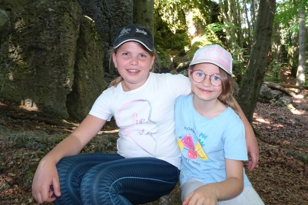 | Die Kids der FFW Geschwand und des FSV Geschwand mit den Betreuerinnen am "Wolfstein" bei Bärnfels |