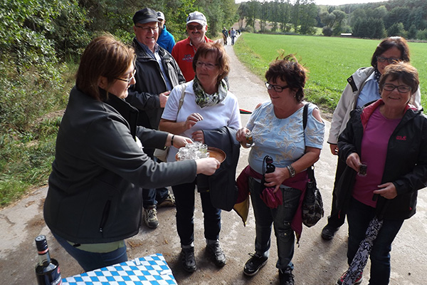 Zum zweiten Mal lud Georg Wiesheier aus Hirschaid und seine Familienanghörigen die FSV-Wanderfreunde zu sich ins Regnitztal ein. Bei anfänglichem Nieselwetter, jedoch immer besser werdenden Wetter führte Georg Wiesheier zusammen mit Wanderwart Werner Schmidt die 19 Wanderfreunde am 02. Oktober 2016  bei der traditionelle Herbstwanderung des FSV Geschwand die Wandergruppe durch seine Heimat. Nach Ankunft mit dem Bus in Sassanfahrt war am Schulgelände Start der Wanderung. Vorbei an der Siedlung Juliushof führte der Wanderweg dann durch die Sassanfahrter Flur zur Seußlinger Höhe. Hier wurde eine von der Familie Wiesheier organisierte und spendierte kleine Kaffeepause eingelegt. Auch hatte man auf dem Weg und von hier einen schönen Ausblick ins Regnitztal. Im Osten zog sich der gesamte Höhenzug von den Mainbergen, über die Friesener Warte bis hin zur Fränkischen Schweiz entlang. (Also von Bamberg bis zum Walberla.) Über den Rothensander Berg führte die Strecke dann wieder  ins Tal hinab. Durch den Wald bei Köttmannsdorf (hier wartete noch eine kleine Tankstelle auf die Wanderer), gelangte man dann zum Vereinsheim des Trachtenvereins "Ebrachtaler Köttmannsdorf". Hier ließ man dann die Wanderung bei einer Brotzeit ausklingen.