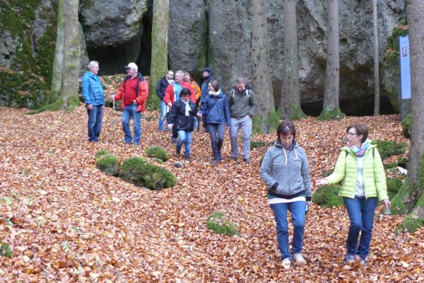 | Nach der wetterbedingten Absage der FSV-Herbstwanderung vom 03. Oktober 2017 konnte die Wanderung am 22. Oktober 2017 bei trockenem, jedoch kühlem Herbstwetter nachgeholt werden. Von der Kreuzung in Geschwand aus ging es mit dem Bus nach Leutzdorf. Von dort führte Wanderwart Werner Schmidt die 34 Wanderfreunde (jüngste Teilnehmerin war mit 103 Tagen Sophia Haas) in nordöstlicher Richtung zur Esperhöhle. Nach einem ausgedehnten Aufenthalt an, um und in der Esperhöhle durchstreiften die Wanderfreunde aus Geschwand die herbstlich gefärbten Laubwälder in Richtung Burggaillenreuth zum Gasthof Wolf, wo der ehemaliger Geschwander Robert Rupp (Bobby) schon auf die durstigen und hungrige Wanderer wartete. Bei süffigen Bier und schmackhaftem Essen verbrachten die Ausflügler ein paar gemütlichen Stunden bevor es mit dem Bus wieder Richtung Heimat ging.