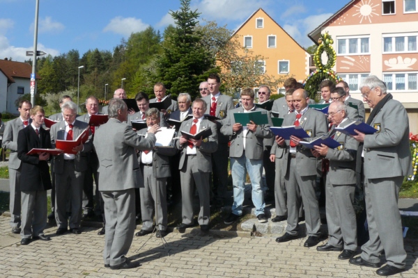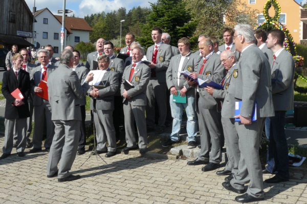 Osterkonzert am Osterbrunnen in Geschwand grautulierte der GGG dem Jubelpaar nochmals mit zwei Liedern und Bürgermeister Willi Müller im Namen der Gemeinde Obertrubach. Im Anschluss machten sich die Sänger dann noch auf nach Bieberbach um dort am Osterbrunnen bei herrlichen Wetter die vielen Besucher auf den Frühling einzustimmen. Von Franz Galster verfasste Berichte über das Singen an den Osterbrunnen sind im "Fränkischen Tag" und in den "Nordbayerischen Nachrichten" erschienen. |