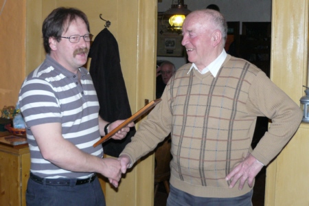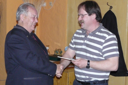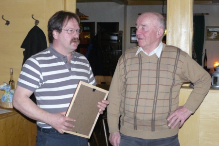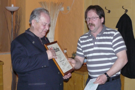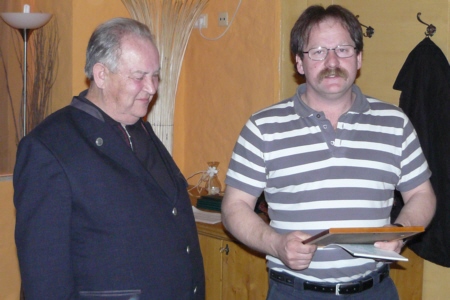 | Am 21. März 2009 hielt der Obst- und Gartenbauverein Geschwand seine Jahreshauptversammlung im Gasthof "Alter Wirt" ab. Nachdem der 1. Vorsitzende Adolf Zellmann seinen Bericht verlesen hatte, konnten sich die 25 anwesenden Mitglieder stärken. Im Anschluss ans Essen durfte Adolf Zellmann Herrn Johann Egloffstein für 25 Jahre Mitgliedschaft im Verein ehren. Eine sehr bemerkenswerte und seltene Auszeichnung wurde Siegfried Gmelch zu teil. Ihn ehrte Adolf Zellmann für seine 50-jährige Tätigkeit als Kassier im Obst- und Gartenverein. |