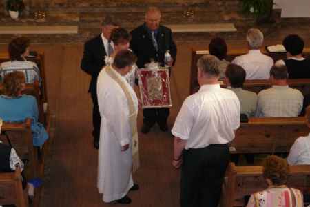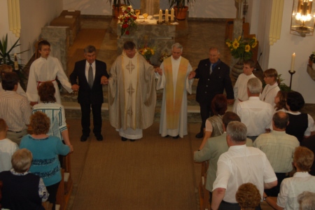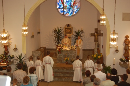| Am 15. August 2007 (Mariä Himmelfahrt) wurde die von Willi Müller gestiftete Orgel im Rahmen eines von H. H. Pfarrer Werner Wolf zelebrierten Festgottesdienstes geweiht. Organist Richard Mager spielte zu diesem Anlass Trompet Voluntary von John Stanley, das Ave Maria von Franz Schubert und Hornpipi/Wassermusik von Händel. Umrahmt wurde der Gottesdienst von der Singgruppe des FSV Geschwand. Anschließend trafen sich die Geschwander und Lindner Bürger im Zelt unterhalb der Kirche bei Bier und Gegrilltem zum gemütlichen Beisammensein. Der Erlös der Orgelweihe und des Festes kam der Geschwander Kirche zu Gute. |