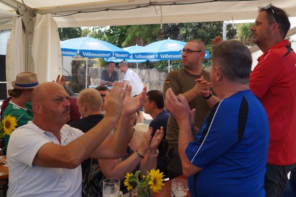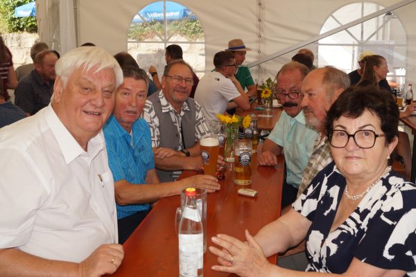 Im Anschluss fanden sich die Geschwander und Lindner Bürger auf dem Bürgerplatz zum traditionellen Frühschoppen mit Weißwürsten und Weißbier ein. Bei strahlendem Sommerwetter um die 30 °C verbrachten die Gäste dort gemütliche Stunden. Für die musikalische Umrahmung sorgte eine von Patrick Grellner zusammengestellte Blaskapelle, die beste Stimmung verbreitete.